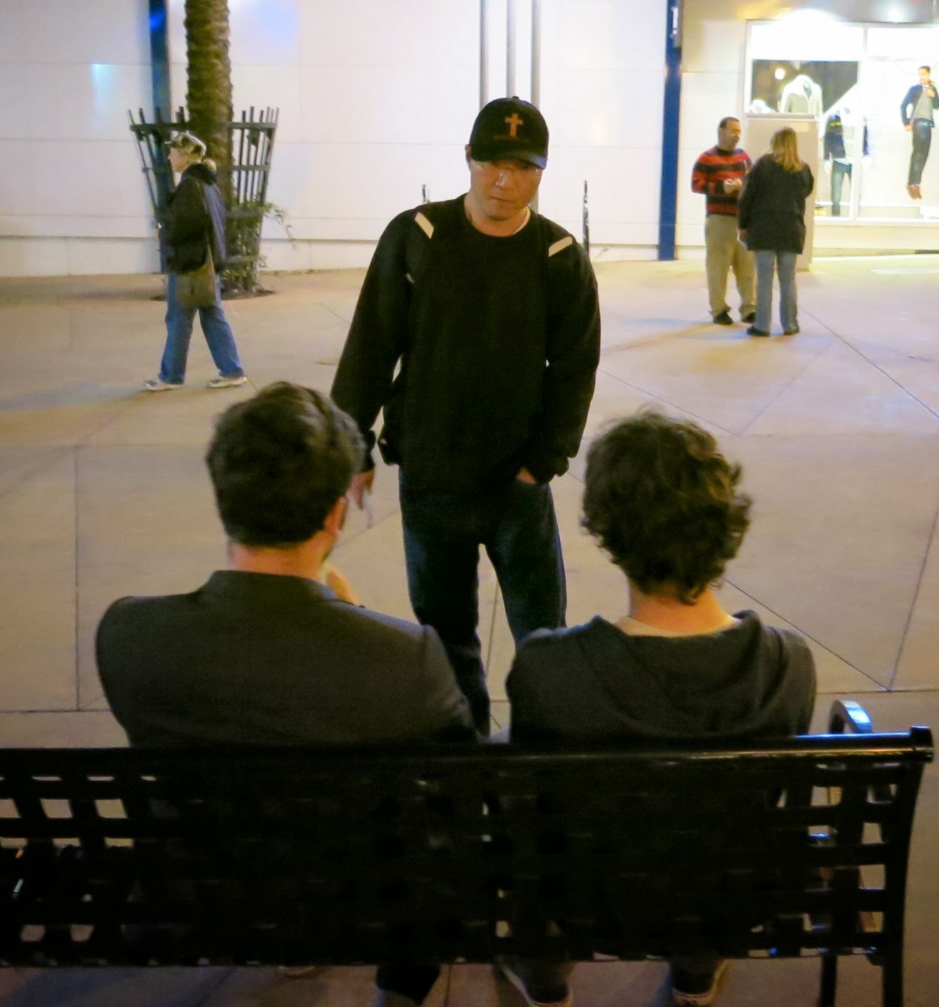 When we arrived at our usual location we were met with the rather intimidating crowd seen here. A street performer from another area was blasting the mall with a loud p.a. and drew this throng as if by magic. Jerry, the owner of the Market City Caffe came out to talk with us as we set up. He was, once again, seeking our help in interceding on his behalf with the performer, to get him to lower the volume. Jerry claims to be a Christian, as well as a friend of Francis Chan. Yet he also says that he has issues with our mention of hell and judgment. He is always very cordial to us, but he emphasizes his plan to approach the City Council with the idea of requiring permits from the street performers, which he warns will undoubtedly affect us.